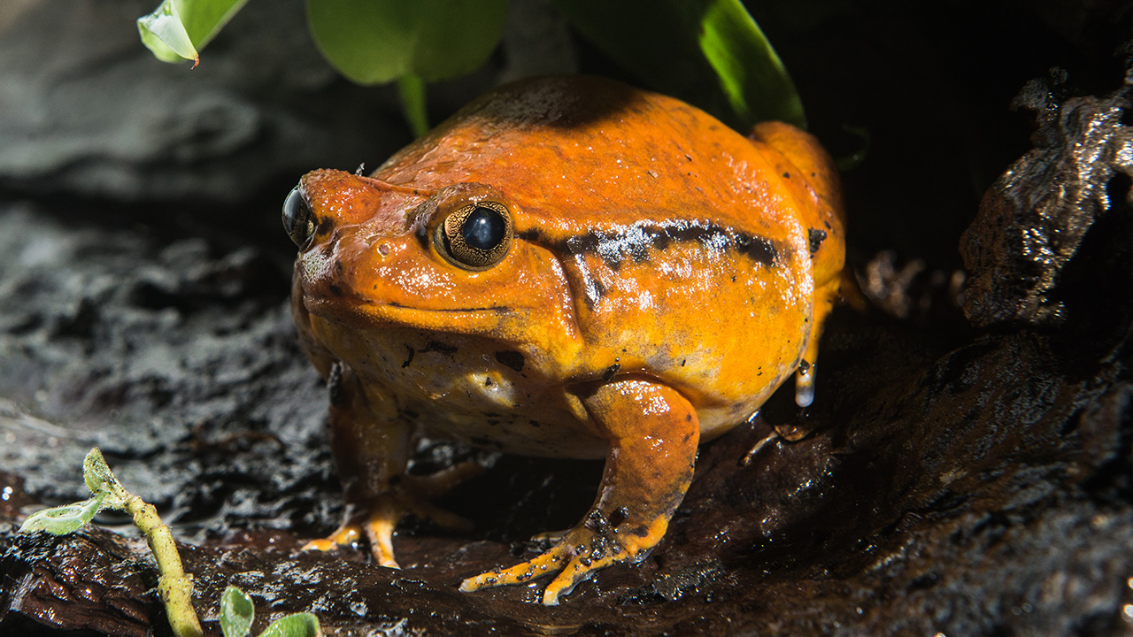 Im Märchen treten Frösche und Kröten in vielen Rollen auf: als abstoßendes Getier, als weise, wenn auch gruselige Helfer und nicht zuletzt – als Traumprinzen! In Wirklichkeit ist die Amphibienwelt um einiges vielfältiger. Wenn ein Frosch auf einem Seerosenblatt im Teich sitzt, ist sein Hauptanliegen das Überleben. Er muss Beute finden und fangen – und er muss versuchen, sich selbst vor Fressfeinden möglichst gut zu verstecken. Der Glasfrosch hat dabei einen Vorteil: Er ist schlecht zu sehen. Sein Umriss verschwimmt, ganz besonders bei Sonnenlicht. Denn der Glasfrosch ist durchscheinend, Sonnenstrahlen werden von seiner Haut nicht reflektiert, sondern durchgelassen. Bei genauem Hinsehen kann man sein Skelett und seine inneren Organe erkennen – aber die äußere Froschkontur verschwimmt dem Jäger vor den Augen. Frösche sind nicht nur die ungekrönten Könige des Weitsprungs, manche Arten betätigen sich gar als Fallschirmspringer. Der Rotaugenlaubfrosch lebt in den Baumkronen des Regenwaldes in Südamerika. Mit den Haftscheiben an seinen
