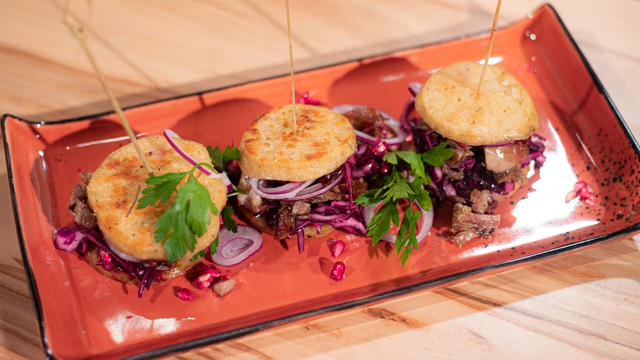 Denn unser TV Koch bereitet einen Rotkohlburger mit Gänsefleisch und Knödeln zu.
